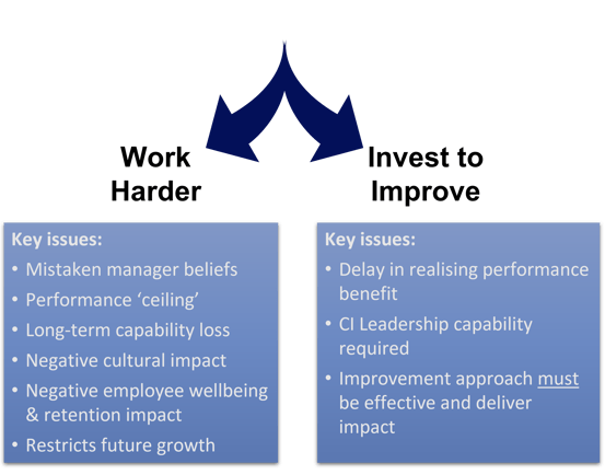 So, back to those two alternate decisions faced by leaders who need to improve performance of the organisation; work harder or work smarter. 'Work smarter' is one of those terms that has become tainted through over-use, and therefore joined the lexicon of 'business speak bingo' long ago, so we'll rename that choice in this article as "Invest to Improve".